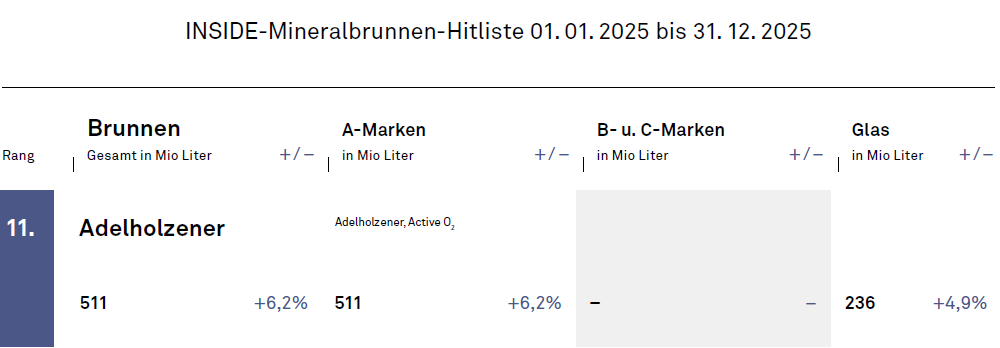 Seit im Februar 2025 nach sehr kurzem Interregnum die damalige Gf Silke Reuter rausgeworfen wurde (INSIDE 970), regiert Allein-Gf Peter Lachenmeir, ein Techniker, adjustiert von der langjährigen Vertriebs-Legende Stefan Hoechter, der als Beirats-Chef immer noch die Strippen zieht. Und natürlich von Vertriebschef Reinhard Sixtus, der mit seiner Truppe unaufgeregt einen sehr coolen und offenbar auch erfolgreichen Job macht. Der 2025 allerdings auch dadurch angefeuert wurde, dass Adelholzen eine Preiserhöhung auf den 1. April 2026 verlegte.