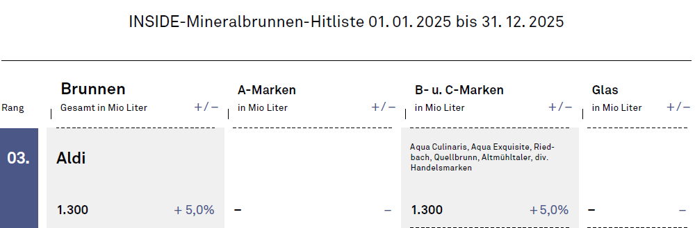 Produkte für die Erzfeinde. Am 1. März 2023 hatte Aldi Nord den Altmühltaler Mineralbrunnen mit den Produktionsstandorten Breuna in Hessen und Treuchtlingen in Bayern erworben. Damals übernahm Nicolas de Lope die Verantwortung, der jüngst zum CEO von Aldi Nordaufgestiegen ist. Aldi sicherte sich nicht nur Brunnen, sondern auch das Know-how einiger Manager. Alexander Pascher und Mario Geske, wichtige Mitarbeiter schon zu Zeiten von Ex-Inhaber Michael Schäff, blieben. Geske geht wie berichtet (INSIDE 983) zum Jahresende. Der Übergang ist vorbereitet. Bereits am 1. September 2025 kam Felix Regehr, zuvor Managing Director für Aldis Kaffeegeschäft , und wurde neben Mario Geske und Alexander Pascher Geschäftsführer.