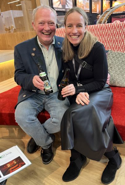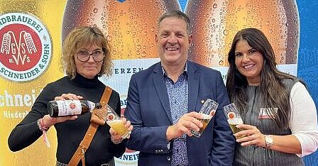 Frisch eingeschenkt für die Skisaison: Schneider Weisse-Exportchefin Susanne Hecht hat dem österreichischen Vertriebspartner Morandell das ab 1.12. erhältliche Schneider Helles Alkoholfrei mitgebracht. Daniel Grüner, zuständig für das Ötztal, und seine Zillertaler Kollegin Stefanie Eberharter (re.) dürfen als erste probieren.