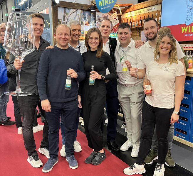 Für die Winzz-Gründer Manuel Scheyerl (li.) und Stefan Staudinger (2.v.li.) ist mittlerweile alles ein paar Nummern größer. Mit der Übernahme ihrer Weinschorle durch die Valensina-Tochter Wolfra weitet sich das Vertriebsgebiet über Bayerns Grenzen hinaus aus. Unterstützung gibt‘s von alten und neuen Weggefährten: Der Haager Festwirt Herbert Zeilinger, Regina Voderholzer, Wolfras stellv. VKL Gastro Franz Hartl, die GVLs Andreas Sarcher und Daniel Stockmeier sowie Sabrina Schußmüller (v.li.n.re.).