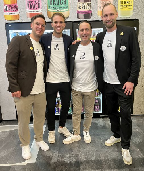 Vier Flaschen-Kasanovas auf drei Ebenen: Rauch Deutschland Gastrochef Max Zimmermann (2.v.re.) mit seinem VKD Süd Christian Buchner (2.v.li.) und dessen GVLs Michael Paulus (Südbayern) und Patrick Neeß (re., Nordbayern).