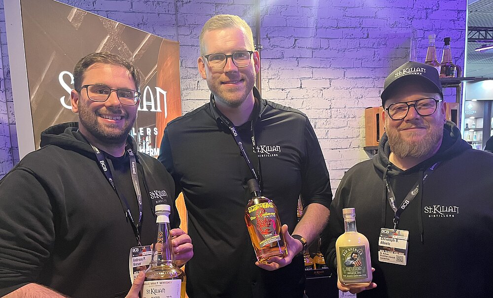 Event-Mann Andreas Kreser, Vertriebsleiter Kai Bentlage und Markenbotschafter Christoph Albietz präsentieren Sondereditionen von St. Kilian. Die Destillerie kommt auf rund 300.000 Flaschen jährlich.