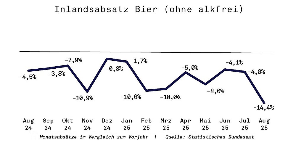 Die Talfahrt für Bier setzt sich fort, die Absätze der deutschen Brauereien und Bierläger haben im August noch stärker gelitten als in den Vormonaten. Laut heute veröffentlichten Daten des Statistischen Bundesamts lag der Absatz im August 2025 14,8% unter Vorjahr. Im Inland fehlten 14,4% (entspricht 890.000 hl), die Auslandsabsätze verloren 16,9% (EU: 11,8%, Drittländer: 23,6%). Besonders gelitten hat der Süden: Bayern lag 19,9%, Baden-Württemberg sogar 39,2% unter dem Vorjahresmonat. NRW hielt sich mit -4,9% vergleichsweise schadlos.