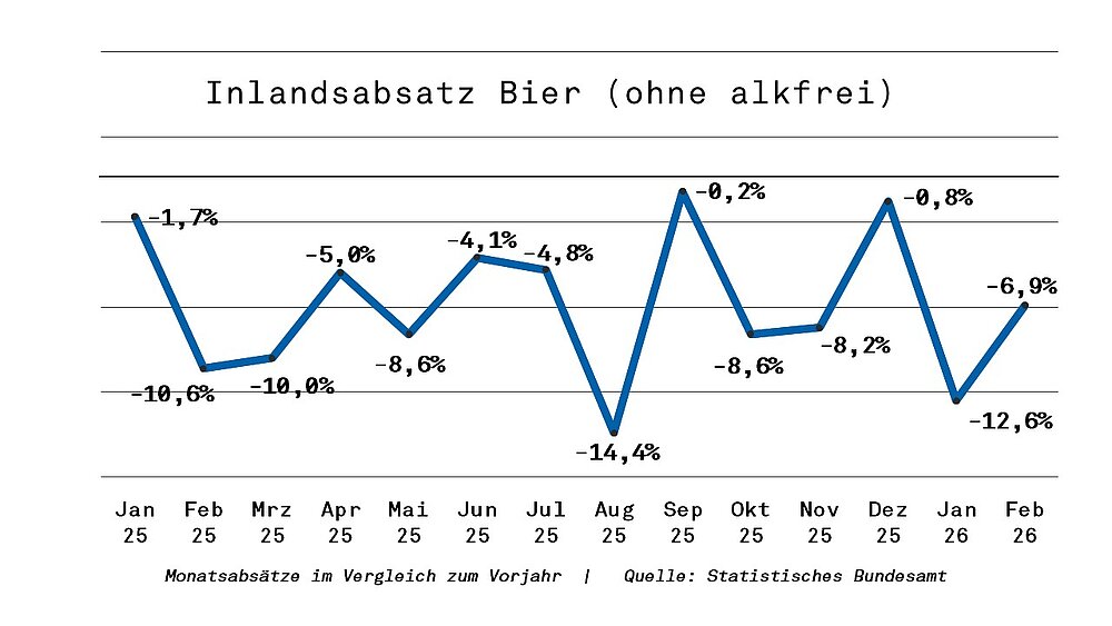 Weiter gnadenlos im Minus hängt der Absatz derweil im Inland, wo das Amt seit Juli 2024 kein Plus mehr registrierte. Im Februar 2026 hing der Absatz - 6,9% unter dem des Vorjahresmonats. Bereits nach zwei Monaten ist im Inland nun ein Minus von 9,4% aufgelaufen.