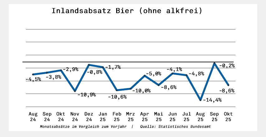 15 Monate in Folge unter Null: Die Biermisere will nicht enden. Auch im Oktober nicht, als der deutsche Bierabsatz insgesamt um satte 9,5% (-611.550 hl) unter Vorjahr lag. Im Inland fehlten im Oktober 8,6% oder 458.129 hl. Im Ausland gingen 13,9% verloren, was durch das Minus von 27,5% des Bierabsatzes in Drittländer (v.a. China, Russland) zu erklären ist. Aufgelaufen fehlen zum 31. Oktober 6,3% oder 4,436 Mio hl.