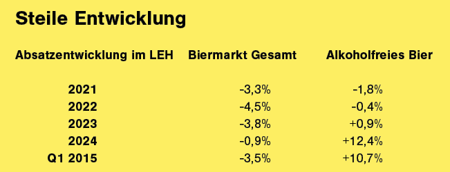 Seit Erdingers genialem Coup, alkoholfreies Weizen als Sportgetränk zu vermarkten, fehlten die Impulse. Alkoholfreies Bier bewegte sich nur etwas besser als der Gesamtmarkt (siehe Marktforschung unten). Die mit hohem Aufwand hergestellten Biere legten zwar an Qualität über die Jahre deutlich zu, doch im Absatz waren keine großen Sprünge drin.