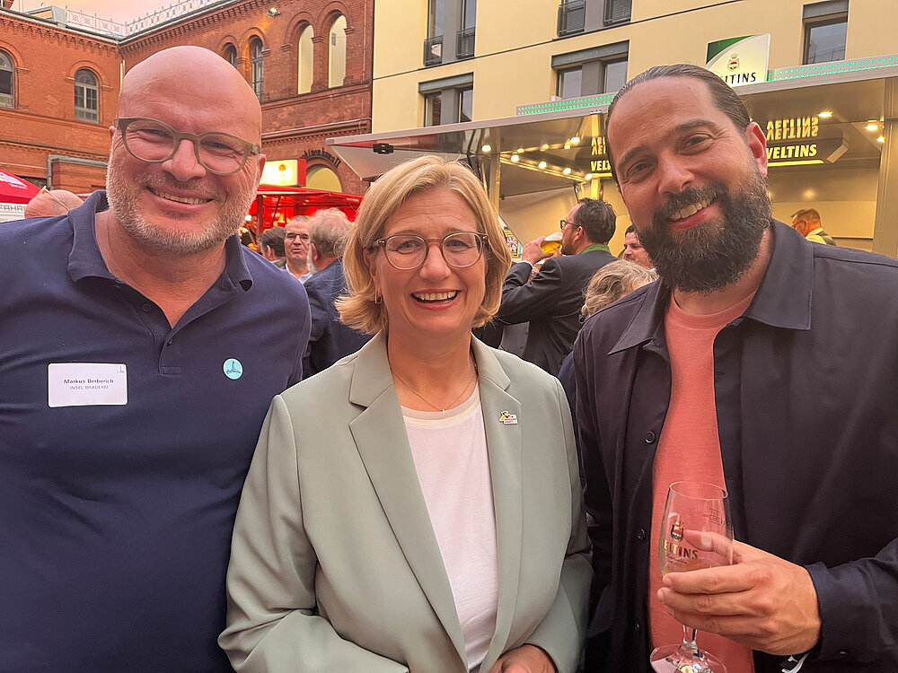 Die drei vom Saarland: Ministerpräsidentin Anke Rehlinger (SPD), derzeit auch Bundesratspräsidentin, wurde beim Berliner Brauertag vergangene Woche als neue Bierbotschafterin von ihrem Homburger Nachbarn und Brauer-Präsident Christian Weber (Karlsberg) und dem Rügener InselbrauerMarkus Berberich (li.) flankiert, selbst ein Saarländer.