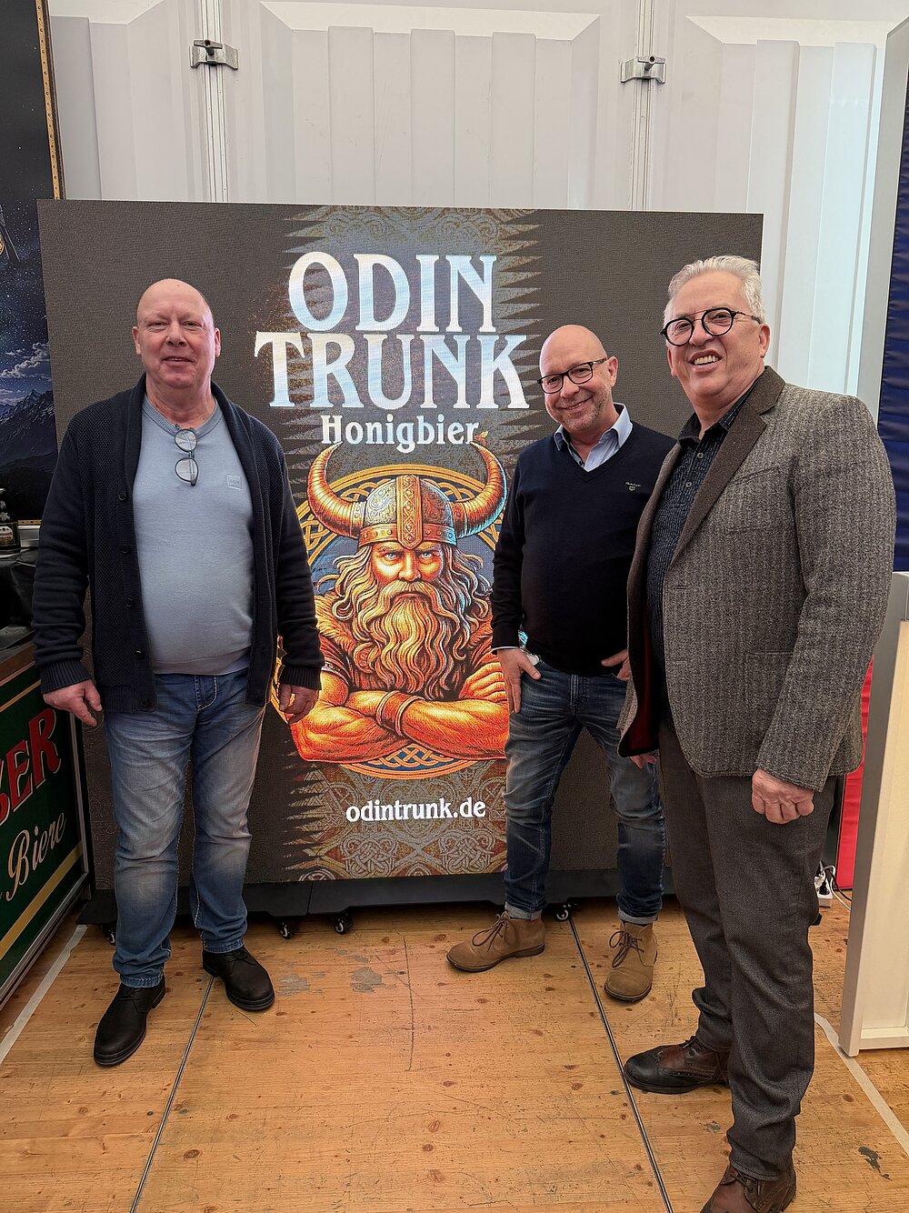 Die Greizer Vereinsbrauerei setzt alles auf Odin Trunk. Das Honigbier köchelt bei 2.000 hl auf kleiner Flamme. Greiz-Geldgeber und -Gf André Panse (re.) samt Vertriebschef Matthias Montel und Frank Neuhaus (li., Gastro Thüringen) wollen die Marke behutsam aufbauen