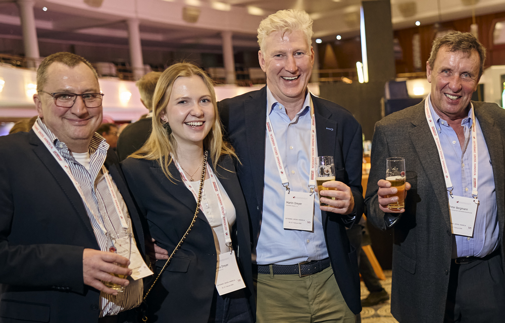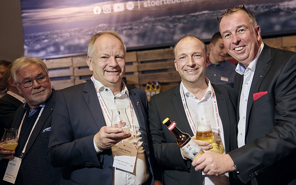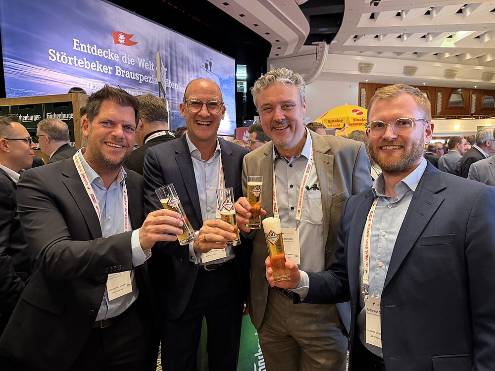 Nord-Connection: Störtebeker-Vertriebschef Jürgen Neuhaus und Team Beverage-CEO Dr. Thomas Spiegel mit GFGH-Vorstand Dirk Reinsberg. Positiv kritisch beobachtet von Reinsberg-Vorgänger Günther Guder (li.)