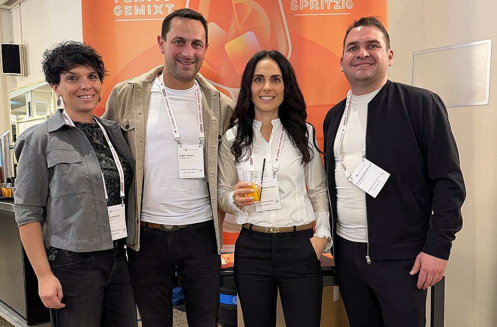 Setzen viel Hoffnung in ihre Eigenmarke Spritz Aperitivo im 5-Liter-Fass: FZ-Getränke-Inhaber Christoph Zimmermann mit seiner Schwägerin und Weinfachfrau Corina Zimmermann sowie Innendienstmitarbeiter Jürgen Martin und Lageristin Claudia Bechteler