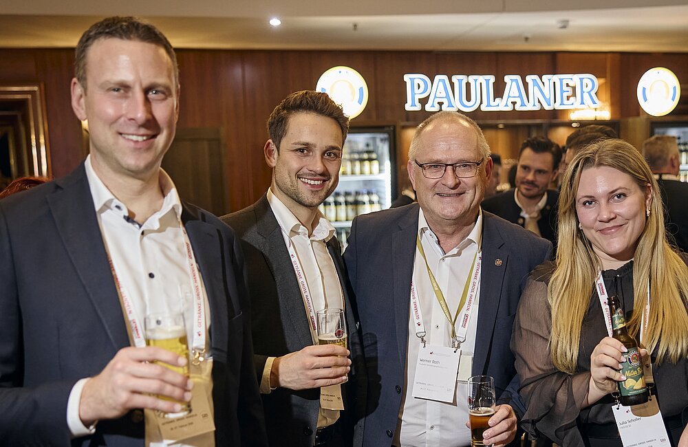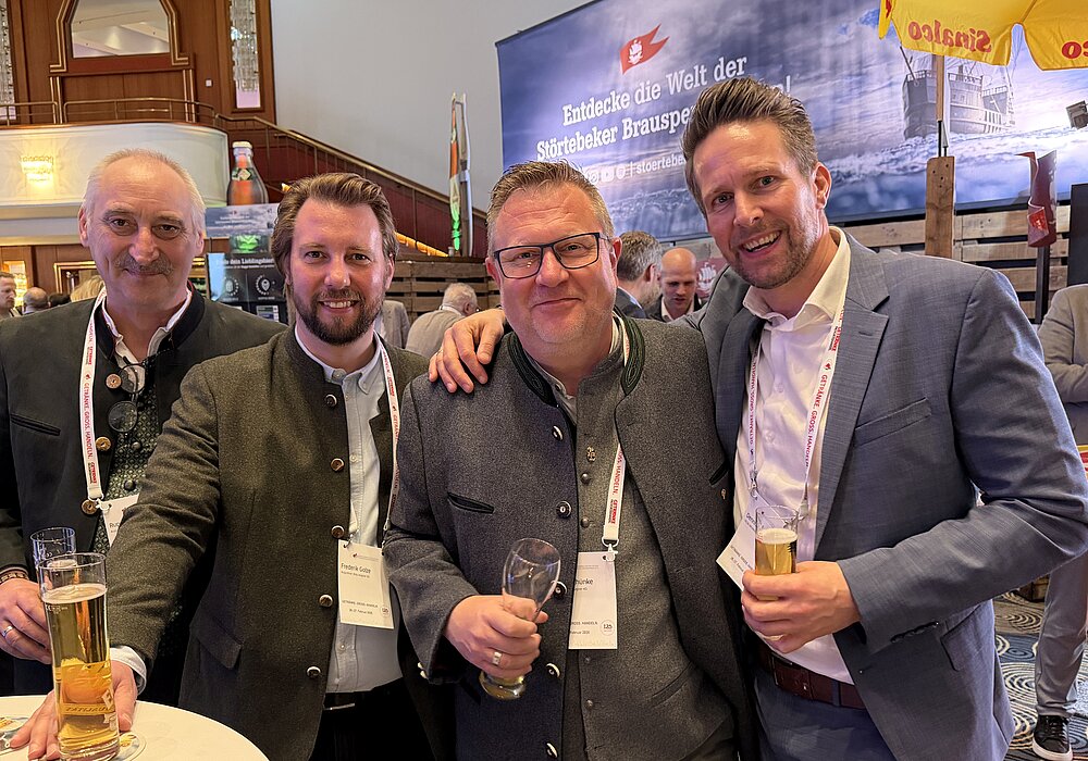 Ur-Augustiner Rupert Ostermaier flankiert von drei ExWarsteinern: Frederik Golze (seit Oktober 2024 erster GVL Nord bei Augustiner), Robert Schünke (seit knapp drei Jahren Gustls GVL NRW) und Dennis Kayser, der vor einem Jahr zu Vilsa abgewandert ist