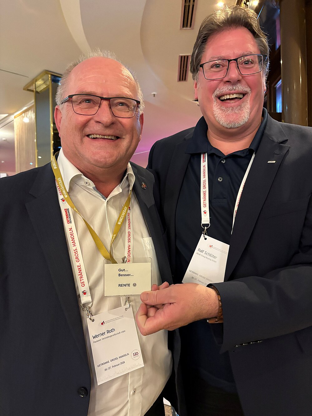 Gut, besser, Rente: Rewe-Einkäufer R. Schlüter verabschiedet Paulaner-KA W. Roth (li.)