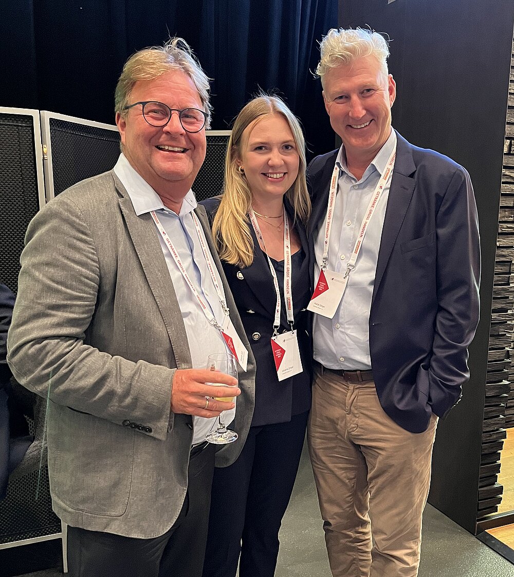 Der Münsteraner Verleger Martin Dreyer (r.) stellt Früh-Gesellschafter Alexander Rolff seine Tochter Johanna Dreyer vor