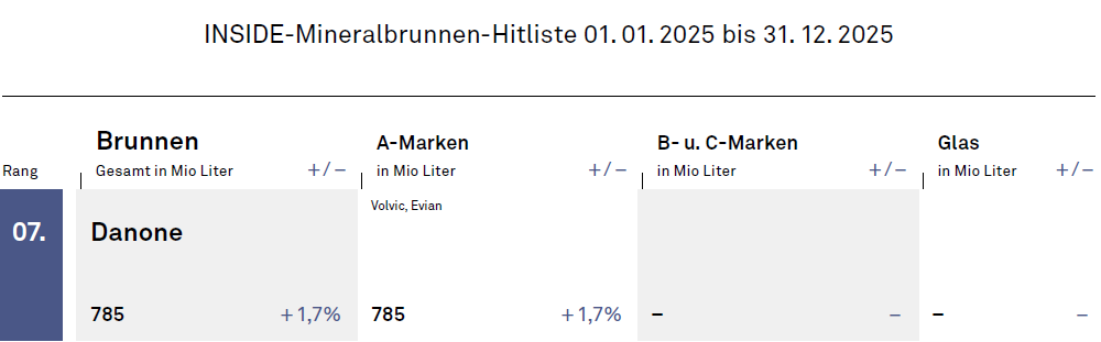 Die im 2024er Jahresbericht formulierte Hoffnung eines Umsatzsprungs von 16,9% (+58 Mio Euro) wurde 2025 verfehlt. Ein kleiner Zuwachs von zweieinhalb Prozent auf 351 Mio Euro kam am Schluss heraus. Die kleine Nebenmarke Evian robbt sich wieder in Richtung 40 Mio Liter, bekommt aber per 1. Februar 2026 eine Preiserhöhung von 13 Cent/Flasche verpasst. Zum gleichen Zeitpunkt gehen auch die Preise für die 20 mal so große Marke Volvic wieder hoch. 2025 konnte Volvic nicht vom wachsenden Markt für Stilles Mineralwasser (laut YouGov + 4,2% im Jahr 2025 vs. Vorjahr) profitieren. Abzüglich der Zuwächse bei Volvic Vitamin+, Volvic Touch und Volvic Tee trat Volvic Naturelle auf der Stelle. Die mit Abstand wichtigste Sorte Volvic Naturelle stößt in der Distribution an Grenzen: kein Drogeriemarkt, kein Discounter, kein LEH ohne Volvic. Und der Fachhandel hält an der Kiste fest, die preislich nicht mit den Einweggebinden konkurrieren kann.