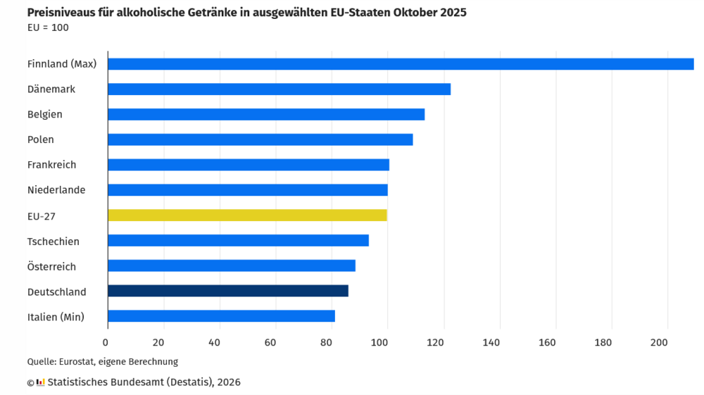 Nirgendwo außer in Italien sind in Europa Wein, Bier und Spirituosen so billig wie in Deutschland. Das belegen einmal mehr Zahlen des Statistischen Bundesamtes. Demnach lagen die Preise für alkoholische Getränke im Einzelhandel im Oktober 2025 in Deutschland 14 % unter dem Durchschnitt der Staaten der EU. Nur in Italien waren alkoholische Getränke noch günstiger (-19 % gegenüber EU-Durchschnitt).