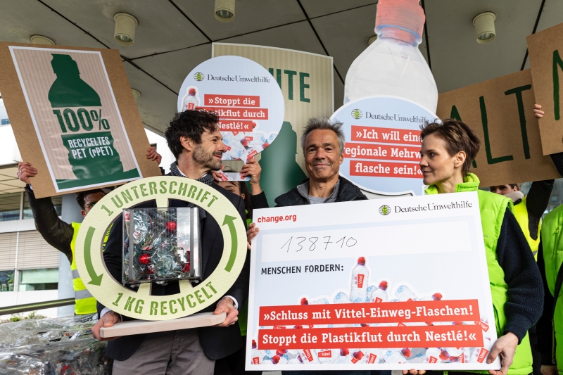 "Riesen-Konzerne wie Nestlé tragen dazu bei, dass wir im Plastikmüll versinken und der Klimawandel immer weiter angeheizt wird. Die ressourcen- und energieintensive Herstellung zig Millionen unnötiger Einweg-Plastikflaschen trägt erheblich zu diesem Problem bei und die Verbraucherinnen und Verbraucher wollen, dass es gelöst wird“, so Jaenicke, der auch betonte, dass Nestlé in der Verantwortung sei.