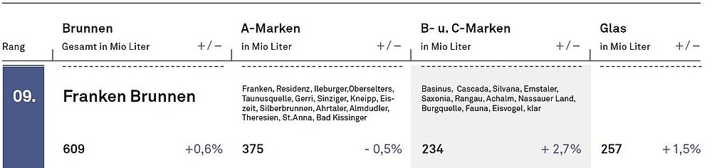 Gewachsen ist der Absatz von Sachsenquelle (+1,5%) und Silber Brunnen (+1,8%), Residenz blieb mit +/-0 stabil. Dagegen gab neben Rominas Eiszeit Quelle (-5%) auch das Gruppen-Flaggschiff Franken Brunnen Volumen ab und verlor 3,5% auf gut 120 Mio Liter, obwohl die Marke in der Gastronomie um 15% zulegen konnte. Überflieger bleibt die höchstpreisige Gastromarke Bad Camberger Taunusquelle, die bei einem Zuwachs von 17% bei annähernd 13 Mio Liter liegt. Allmählich in Gang kommt der restaurierte Standort Bad Kissingen, wo Netto mit Kissinger für Auslastung sorgt und das Marken-Experiment Theresien Quelle allmählich in die Gänge kommt. Die frühere Hoffnungsmarke Kneipp wurde zum Jahresende eingestellt.