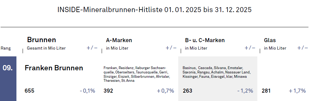 Kein Grund zur Hektik. Ein Nachfolger für den im Juni 2024 in den Ruhestand gegangenen CEO Michael Bartholl bzw. dessen Nachfolger Frank Höhler, der im Januar als Geschäftsführer beim Cölner Hofbräu Früh anfing, ist noch nicht gefunden. Der Wunschkandidat aus der Schweiz hat abgesagt. Der Franken Brunnen-Beirat mit dem früheren Kulmbacher- und Ireks-Vorstand Jürgen Brinkmann an der Spitze muss nicht in Hektik verfallen. Die Zahlen der von Vertriebs-Gf Markus Humpert und Finanz-Gf Christoph Schülner gesteuerten Brunnengruppe sind in Ordnung. Das A-Markenminus wäre ohne die Sortimentsbereinigung im Süßgetränke-Bereich zu verhindern gewesen. Doch ging Humpert mit dem Kamm durch die Schorlen-Palette, 30 Artikel mit einem Gesamtvolumen von einigen Millionen Füllungen wurden gestrichen. Das Süßgetränke-Minus (gruppenweit 4%) drückte die A-Marken. Mineralwasser allein wuchs um 1,9%. Gleiches Bild bei den B-Marken (Basinus, Eigenmarken für Flaschenpost), die bei den Süßgetränken sogar 9% verloren und bei Mineralwasser trotz Preiserhöhung im Plus lagen.