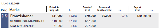 Vandoorne und Geiger machen in einer Zeit die Fliege, in der Franziskaner nach 22 Jahren zum ersten Mal unter 1 Mio hl Absatz rutscht und damit wohl zum letzten Mal in der INSIDE-Biermarken-Hitliste auftaucht. Satte 13% sackte der Absatz im Vergleich zum Vorjahr ab. Von den Früchten der einst stringenten Marketingkampagne, die Franziskaner Weißbier in den Markenolymp katapultierten, ist nichts mehr übrig. Seit über einem Jahrzehnt schon investiert der Konzern kein Geld mehr in die Werbung für die Marke.