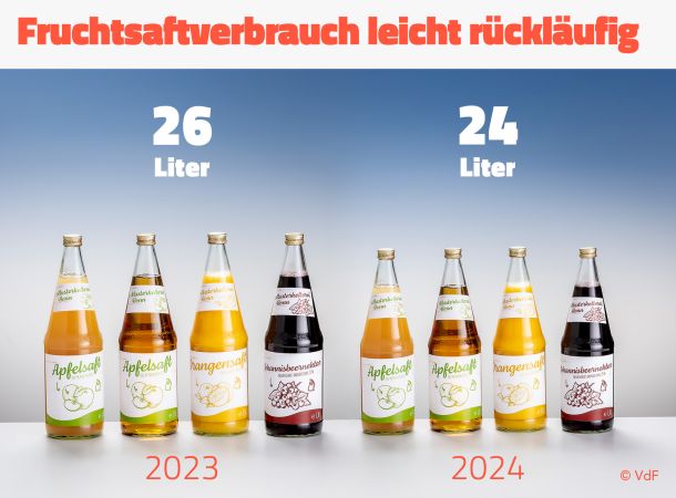 Der Verbrauch von Fruchtsäften und Fruchtnektaren ist im Jahr 2024 weiter gesunken - allerdings weniger als erwartet. Nach Zahlen des Verbandes der deutschen Fruchtsaft-Industrie VdF fiel der Pro-Kopf-Verbrauch von 26 auf 24 Liter. Für den Abwärtstrend sorgte vor allem die wichtige Sorte Orange, die bei der 100%-Variante um 2,6 Liter rückläufig war. Kompensiert haben Nektare (Zitrus, Traube. Grapefruit, Gemüse) mit einem Plus von 0,5 Liter pro Kopf.