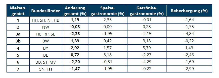 Regional gibt es unterschiedliche Entwicklungen: Bayern (+2,92%) und Baden-Württemberg (+1,39%) zeigen positive Zahlen, während das Saarland, Rheinland-Pfalz und Hessen (-2,33%) sowie Thüringen und Sachsen (-1,47%) stärkere Verluste erleiden. Diese Daten stammen aus dem Gedat Markt Monitor, der vierteljährlich die Aktivitäten im deutschen Außer-Haus-Markt misst.