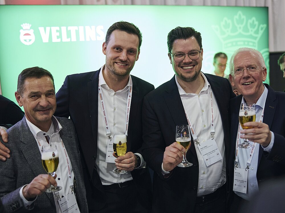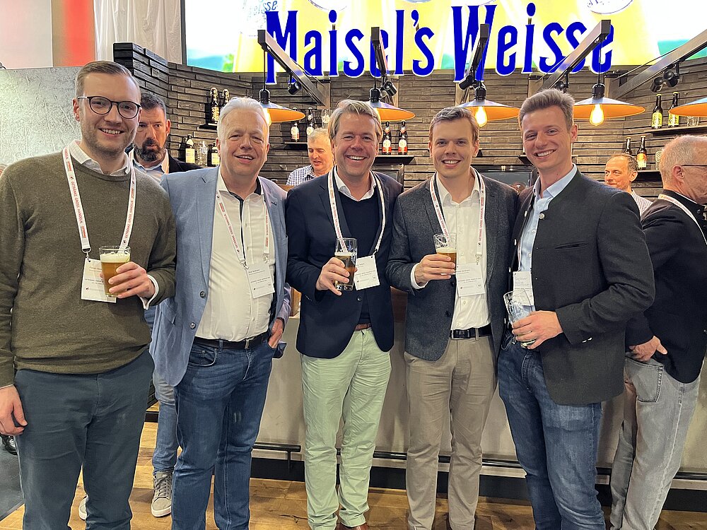 Next Gen: Florian Nordmann (li.) steigt zum 1. Mai ins GFGH-Business seines Vaters Oliver Nordmann (2.v.li.) ein. Bruder Niklas Nordmann führt seit 2020 die Ratsherrn Brauerei. Auch Henning Tadsen (mi.) ist erfolgreich auf den Spuren des elterlichen Betriebs unterwegs und Georg Schneider VII. (re.) läuft sich aktuell für die Nachfolge warm
