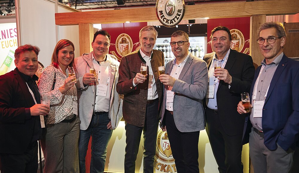 Sehen für unabhängige Strukturen auch in Zukunft einen klaren Vorteil: GES-Vorstand Ulli Berklmeir, Albstädter Fachmarkt-Juniorin Myriam Mebold, Daniel Boecken vom Kölner GFGH-Schwergewicht Boecken, Meckatzer Hochpreisbräu Michael Weiß, Winkels-Lenker Dieter Hamel, Bier-Wurz-Chef Roland Meyer und Fachmarkt-Verleger Andreas Mebold | Foto Düfelsiek