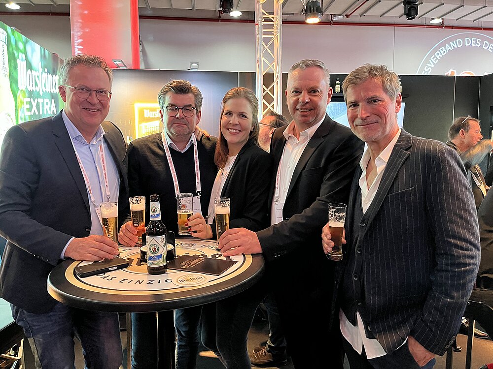 Almdudler-Boss Gerhard Schilling und sein Deutschland KAM Mike Butz stoßen trotz Lizenzvergabe an Krombacher (Alm Radler) mit den Radeberger Regionaldirektoren Wolfhard Buß (Ost) und Michael Reitze (Nord/West; re.) sowie Berlin-Verleger Christian Rößler (2.v.re.) an