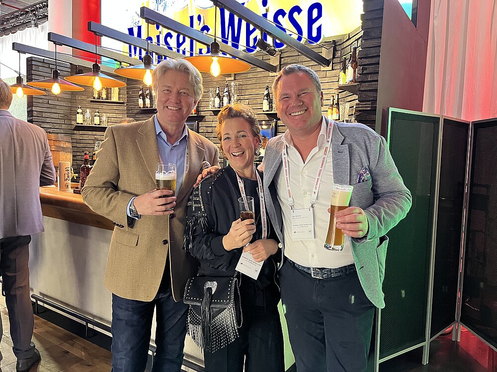 Hamburger Runde in Berlin: Columbus Drinks-Gf Christopher Arp mit Magnus-Chefin Gaby Gaßmann und ihrem scheidenden Vertriebsleiter Marc Böttcher