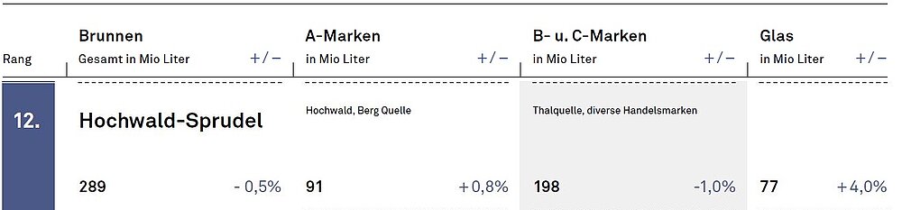 Aus diesem Basiscamp im Hunsrück heraus unternimmt Jensen vielversprechende Marken-Expeditionen. Die Galionsfigur Hochwald-Sprudel erobert in der N2-Flasche und einer 9er-Kiste auch ferne Gründe. In Berlin und Hamburg sind eigene Gebietsverkaufsleiter unterwegs. Die Expansion in Richtung NRW wird mit einem Co-Sponsoring des 1. FC Köln unterstützt. Der Erfolg gibt Jensen bislang recht. Hochwald ist auch 2023 gewachsen. Zuwachs gab es auch bei der Herstellung von Handelsmarken (u.a. Aldi), die um 1,8% auf 189 Mio Liter zulegten. Dagegen wurden die eigenen B & C-Marken weiter eingedampft. Der Absatz ging von 15 Mio Litern auf 9 Mio Liter zurück.