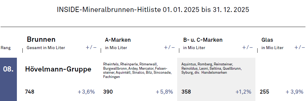 Auf die letzten Meter. Die Duisburger Hövelmann-Truppe mit ihrem breiten Marken- und Gebindeportfolio liebäugelt mit ihrer Erfolgsmarke Fachingen seit Jahren mit der magischen 100 Mio Liter-Schwelle. 2025 hat sie sie endlich gerissen, offenbar in den wirklich allerletzten Tagen des Jahres. 6,1 % lag die Marke letztendlich über Vorjahr, nur übertroffen von der traditionell starken Rheinfels-Range, die mit satten 12,2 % Wachstum bei 130 Mio Litern gelandet sein dürfte. Rheinfels ist bisher mit breitem Sortiment in 0,75 PET Einweg auch bei Aldi unterwegs; mit einem knappen Liter-Drittel ist PET in Duisburg-Walsum deshalb auch vergleichsweise stark repräsentiert. Ob und wie Aldi gegen Ende dieses Jahrzehnts auf eine mögliche Mehrweg-Angebotspflicht regiert, wird man in der Firmenzentrale aufmerksam mitverfolgen.