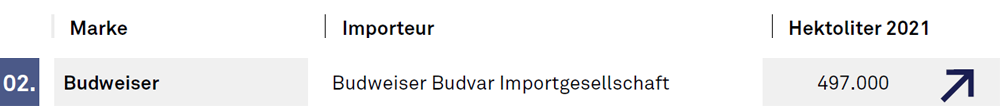 Staatliches Phänomen. Mit insgesamt 507.000 hl ist Deutschland mit Abstand der wichtigste Exportmarkt der tschechischen Staatsbrauerei. Nur 10.000 hl entfallen auf die Nebenmarke Pardál. Budweiser selbst legte um 11% auf 497.000 hl zu, ohne große Werbeetats und mit einer schmalen Mannschaft von nicht mal 15 Außendienstlern. Das unverändert hochpreisige böhmische Lager (Aktionen nur vereinzelt unter 13 Euro je Kiste) hatte das „Glück“, relativ wenig Fassbier (rund 20.000 hl) verteidigen zu müssen. Die Marktführerschaft mussten Deutschland-Chef Rüdiger Schleusner und sein Vertriebs-Gf Holger Sydow dennoch an Heineken abtreten. In Ostdeutschland freilich führt Budweiser die Import-Meute noch mit weitem Abstand an.
