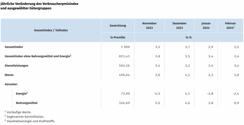 Obwohl im Januar 2024 Preisbremsen für Energieprodukte ausgelaufen sind und eine CO2-Preis-Erhöhung für fossile Brennstoffe wie Kraftstoffe, Heizöl und Erdgas in Kraft getreten ist, waren die Energiepreise im Februar 2024 um 2,4 % niedriger als im Vorjahresmonat. Der Preisanstieg bei Nahrungsmitteln schwächte sich auf +0,9 % im Vergleich zum Vorjahresmonat ab und lag damit erstmals seit November 2021 unterhalb der allgemeinen Preissteigerungsrate.