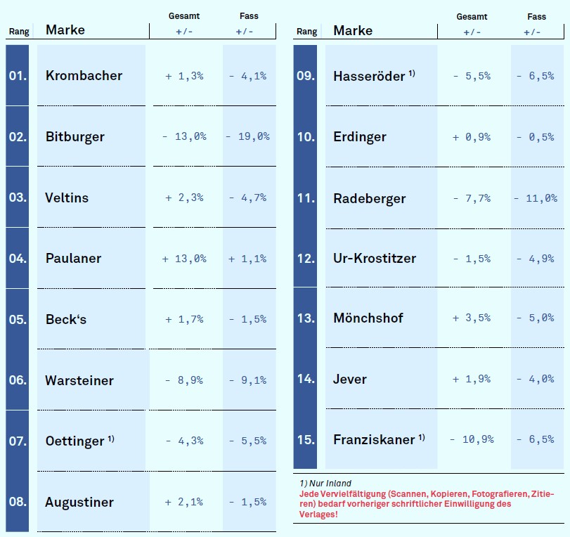 Das Wetter war es nicht. 46% weniger Niederschlag und 36% mehr Sonne als im ersten Halbjahr 2024 hat der Deutsche Wetterdienst für Deutschland erfasst. Das eklatante Bierminus im ersten Halbjahr von rund 6% scheint Ausdruck einer generellen Abwendung vom Alkohol zu sein. Auch die 15 Top-Marken gerieten in den Sog, feierten die wenigen Erfolge fast nur mit Alkoholfreiem.