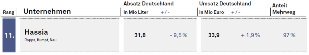 Schonkost. Die Hassia-Gruppe kämpft sich weiter aus der Verlustzone, in die sie 2021 rutschte. Zwischenzeitlich unkten INSIDER, dass die 1998 erworbene Keltereiensparte zur Disposition steht, doch nur der Wilhelmsthaler Mineralbrunnen (letztes Jahr an die Edeka) wurde abgestoßen. Gespart werden muss dennoch. Hassia-Chef Dirk Hinkel propagiert Kostendisziplin und erklärt unlängst: „Wir sind gefordert, unser Leistungsangebot regelmäßig zu überprüfen und auch die Wirtschaftlichkeit jedes Standortes genau zu betrachten.“ An der Fruchtsaftkelterei Rapp’s (an der auch Hassias 50-%-Beteiligung an Waldhoff-Erfurt aufgehängt ist) wird offiziell nicht gerüttelt. Die Rückkehr auf den Wachstumspfad täte gleichwohl gut. Das zarte Umsatzplus von 2023 (+1,9%) resultierte nur an weitergebenen Rohwarenerhöhungen.