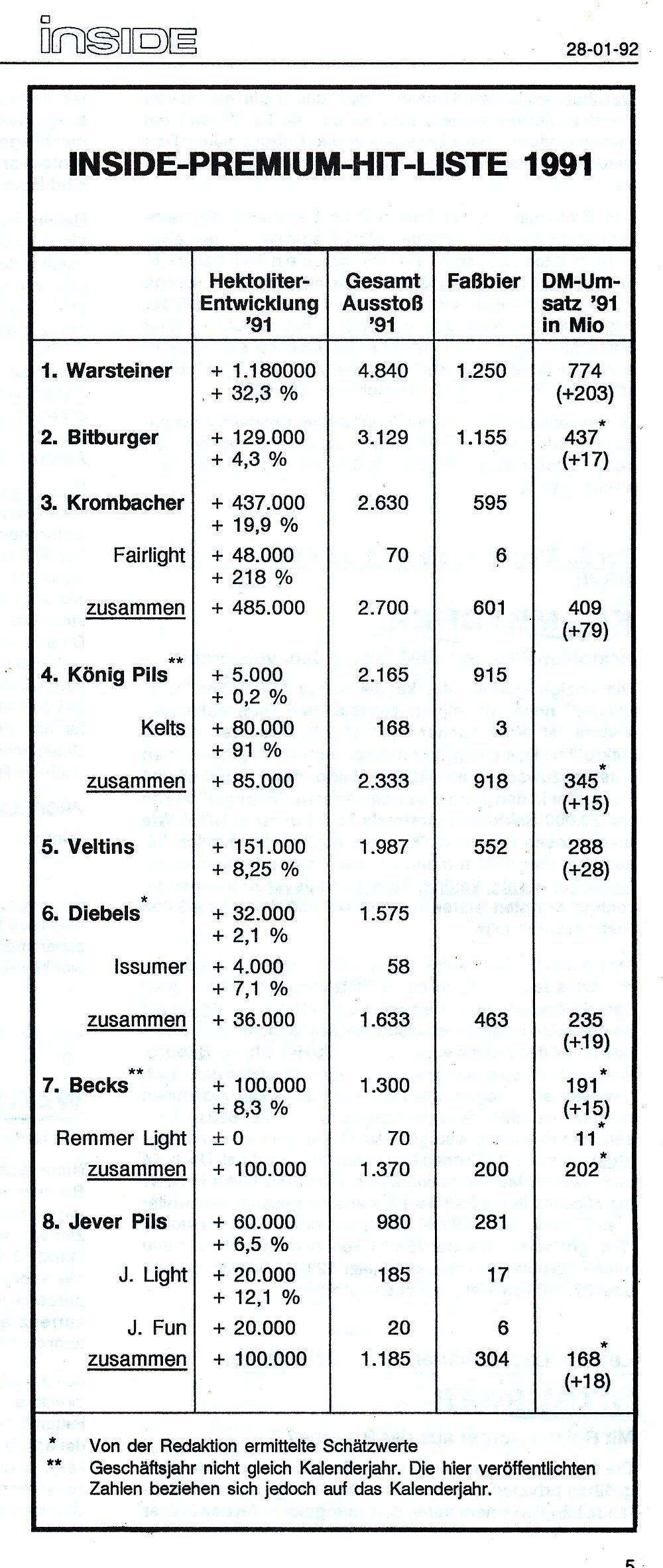 Das waren noch Zeiten für Warsteiner & Co – seinerzeit, als der Marktführer 1991 mit einem Absatz-Plus von sage und schreibe 32,3% gegenüber 1990 seine Spitzenposition zementierte (Oettinger wurde damals, weil keine „Premium“-Marke, noch nicht in der Hitliste geführt). Damals lag der Bierausstoß in Deutschland aber noch bei 118 Mio hl (nur 6,7 Mio hl davon gingen in den Export). 2021 waren es, wenn alles gut geht, noch 85 Mio hl – davon gut 15 Mio hl für den Export.