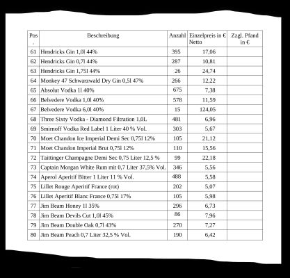 Auffälliger verhält es sich oft beim angeblichen Insolvenzbestand. Hier wurde dann doch mancher Händler stutzig. Über 400 Flaschen Jack Daniels, knapp 300 Flaschen Jägermeister, über 200 Flaschen Moët & Chandon, knapp 600 Flaschen Belvedere Vodka, knapp 900 Flaschen Jim Beam – ganz schön viel Lagerbestand für einen insolventen Händler.