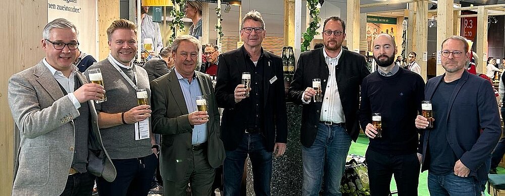 Ausscheider-Party in Halle 9: Ba-Wü Brauer-Präsident M. Schürer, Paulaner-Gf Andreas Steinfatt (geht am 29.2.) und Franken Brunnen-CEO Michael Bartholl (geht zum 30.6.).