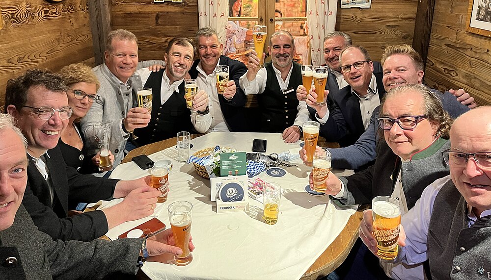 Weißbier-Stichprobe im Hinterzimmer: Die Hälfte trinkt Hell: Klaus Ederer (VD Handel Schneider Weisse), Wolfgang Kuffner (Marketingchef Erdinger), Petra Geberl (Chefsekretärin von Werner Brombach), Andreas Steinfatt (noch Paulaner-Gf), Josef Westermeier (Gf Erdinger), Robert Schraml (Gf Schneider Weisse), Stefan Kreisz (CEO Erdinger), Erich Trott (Gastro-VL Schneider), Florian Bartl (VKL Handel Schneider), Outsider Messner, Ralf Böhm (VD Handel Erdinger), Harald Seisenberger (GVL Gastro Erdinger).
