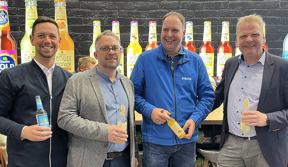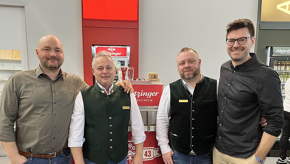 Warsteiners GVL Gastro im Süden Christian Pitscheneder mit Christian Buchner, Max Zimmermann und Patrick Neeß von Rauch Fruchtsäfte, bei denen sich das Team demnächst strukturell und personell verändert.