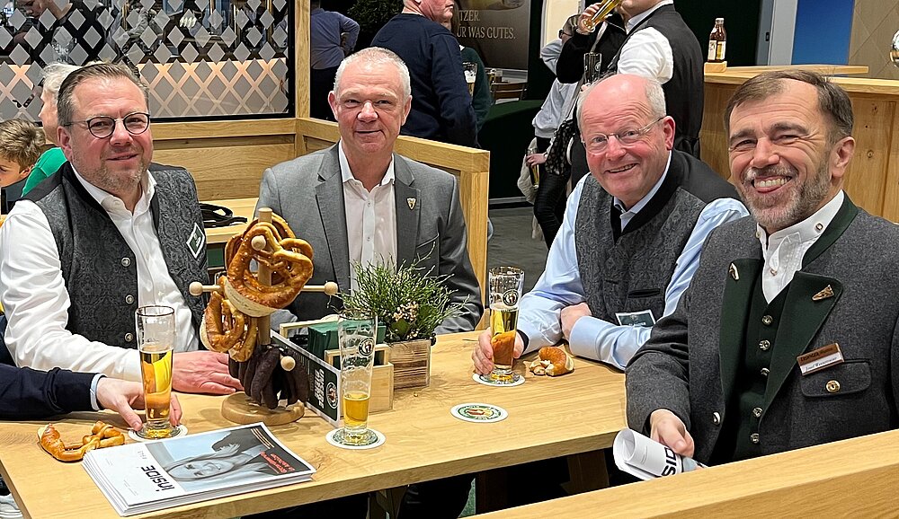 Gewachsene Bierverkäufer-Eichen halten Gegenwind gut aus: Alpirsbacher-Gf Markus Schlör, Ganter-Gf Detlef Frankenberger, Alpirsbacher-Bräu Carl Glauner und Erdinger-Gf Josef Westermeier auf dem neuen, aus Schwarzwald-Holz gezimmerten Alpirsbacher-Stand.