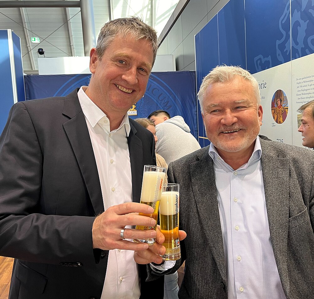 Dr. Josef Schrädler (re.) und Outsider Niklas Other stoßen mit einem Blonde Ale auf das dicke Umsatzplus der bayerischen Staatsbrauerei an.