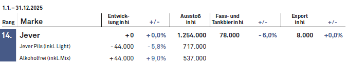 Mehr Potenzial liegt freilich im Alkoholfreien. Die alkoholfreien Varianten der Konzernmarken funktionieren nicht nur bei Jever gut. Insgesamt weist die Radeberger-Statistik über alle Bleifrei-Marken (vom stabilen Clausthaler bis zum Überflieger Guinness 0,0) einen Zuwachs von 7,5% Zuwachs aus. Zu wenig, um den Rückgang im Kerngeschäft ansatzweise aufzufangen.