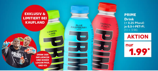 Doch Kaufland spielt da nicht mit. Der Hydration-Drink von den Influencern Logan Paul und KSI wird aktuell vom 21.9. bis 27.9. - laut Handzettel "Exklusiv & Limitiert" - zu einem Preis von 1,99 Euro/Flasche (zzgl. DPG-Pfand) angeboten. Dabei kostet Prime selbst auf dem Online-Marktplatz von Kaufland aktuell 6,50 Euro.