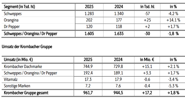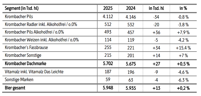 Die gesamte Krombacher Gruppe kam 2025 auf 7,553 Mio hl. Ein leichtes Minus von 0,2%. Insgesamt vergrößerte sich der alkoholfreie Absatzanteil auf rund 40%. Treiber waren die alkoholfreien Biere. Bei den Limonaden-Sorten (Schweppes, Orangina, Dr Pepper), landeten die Siegerländer mit einem Minus von 1,8% bei 1,605 Mio hl.