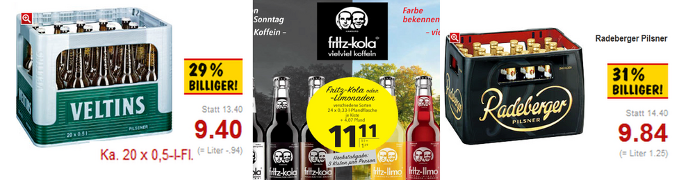 Auf den üblichen Lock-Effekt hat es indessen Citti-Kiel abgesehen. Dort bekommen die Kunden die Kiste Erdingerfür 11,11 Euro und zum selben Preis die 24 x 0,33-Liter Fritz-Kola. Mittendrin im Aktionsverhau: Für die Hamburger Edellimo ein ganz neues Gefühl.