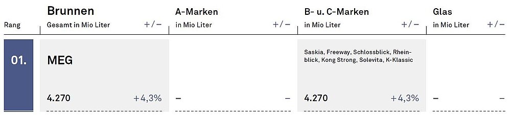 Eine zentrale Rolle spielt die Keimzelle MEG mit 25 Abfüllanlagen an sechs Standorten (Leißling, Jessen, Löningen, Kirkel, Wörth am Rhein und seit Februar Derby-UK) sowie drei Preform- und Granulatanlagen (Roßbach, Neuensalz, Übach-Palenberg). Der Trend zur Eigenmarke wedelte der MEG weiteren Absatz zu. Während die Marktforscher von NielsenIQ für den Discount insgesamt ein Absatzminus von 5,0% ausgerechnet haben, konnte die MEG mit Saskia und Co. sogar noch zulegen. Das veränderte Preisbild beim Eckartikel 1,5 Liter Mineralwasser (binnen eineinhalb Jahren von 19 Cent auf heute 27 Cent je 1,5-Liter) scheint Saskia nicht zu treffen.