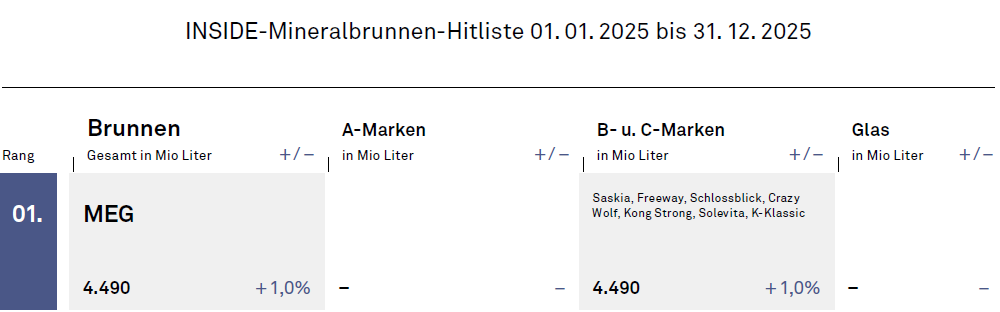 Nummer 26 am Start. Auf dem Planet Schwarz (im Jahr 2024 weltweit 175 Mrd. Euro Umsatz) herrschen stabile Bedingungen. Der Anteil selbst produzierter Eigenmarken bei Lidl und Kaufland wächst. Die Schwarz Produktion (Slogan: „Wir liefern und alle können einpacken“) mit 17 Standorten für Pasta, Schokolade, Snacks, Backwaren, Eis und Kaffee wurde durch die Übernahme von Göbber um Marmeladen ergänzt. Eine zentrale Rolle spielt die Keimzelle, die 2005 übernommene Mitteldeutsche Erfrischungsgetränke MEG. Mit sechs Standorten (Leißling, Jessen, Löningen, Kirkel, Wörth am Rhein und dem über 300 Mio Füllungen großen Werk Derby/UK) sowie drei Preform- und Granulatanlagen (Roßbach, Neuensalz, Übach-Palenberg) bildet sie das industrielle Rückgrat der Getränkeeigenmarken.