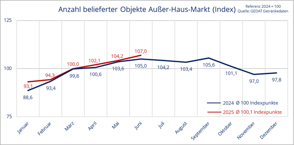Im Juni 2025 steigt der Index des Getränkefachgroßhandels im Außer-Haus-Markt laut Gedat auf 107,0 – ein Plus von 2,7 % zum Vormonat und 1,9 % zum Vorjahresmonat.