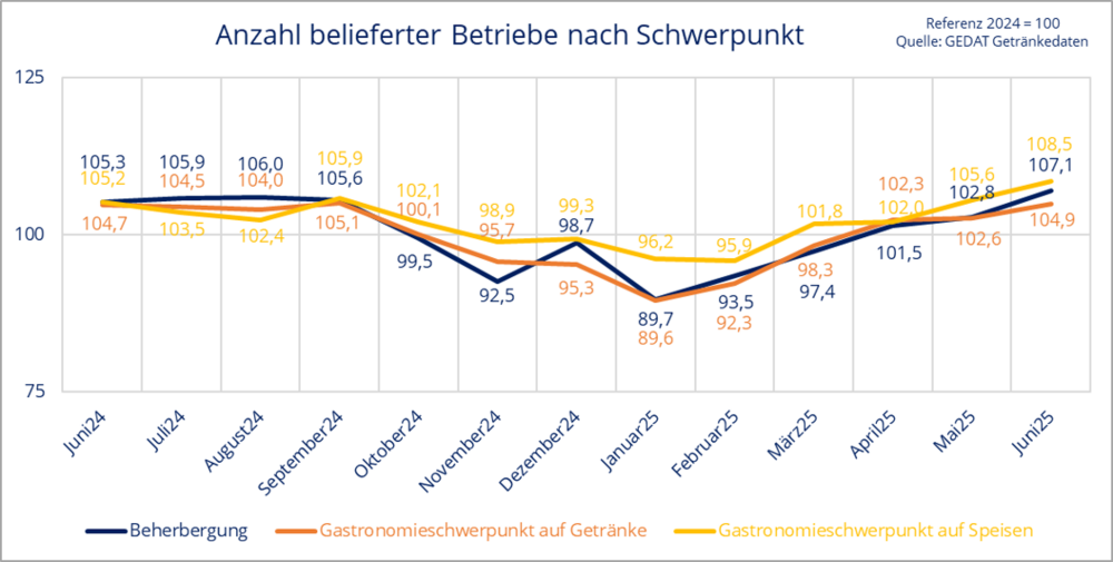 Zur Methodik von Gedat: Die Zahlen basieren auf der monatlichen Anzahl belieferter Objekte durch den Getränkefachgroßhandel (durchschnittlich n = 899 meldende GFGHs). Erfasst werden Lieferungen an Betriebe mit den Schwerpunkten Getränkeausschank (z. B. Kneipen, Bars, Cafés), Speisenverkauf (z. B. Restaurants, Imbisse, Systemgastronomie) und Beherbergung (z. B. Hotels, Pensionen). Mischformen sind häufig. Der Index zeigt die relative Veränderung zur Basis 2024 (Index = 100); ein Wert von 110 entspricht +10 %, ein Wert von 90 = –10 %.